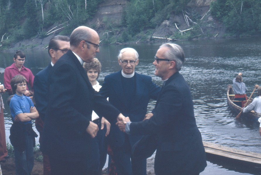 Rev. George Dobie (far right) at the dock at Old Fort William. In the middle facing the camera is Rev. Dr. Agnew H. Johnson of St. Andrew's Presbyterian Church, Fort William. He was Moderator of the Presbyterian Church in Canada until early June, 1973.