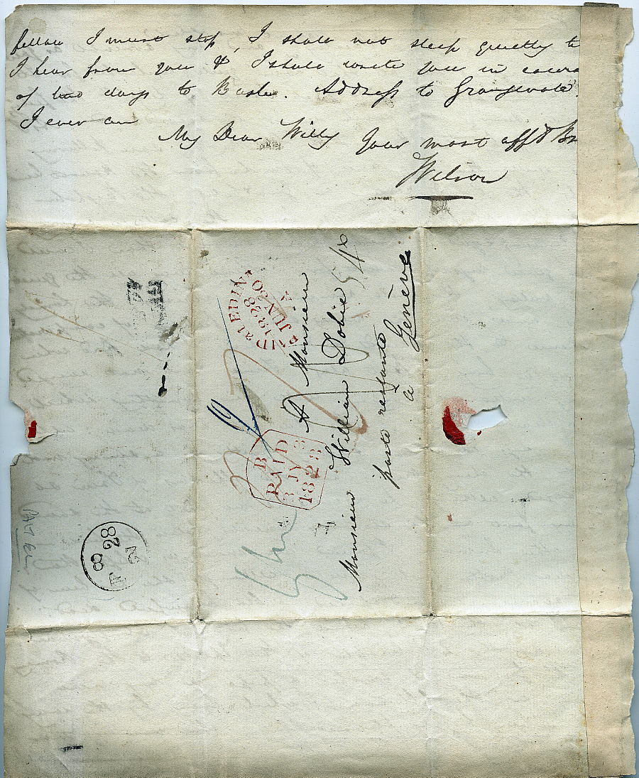 This letter was purchased on Ebay, November, 2018. It was mailed on June 30, 1828 in Edinburgh, Scotland, and is addressed to "Monsieur William Dobie, poste restante, a Geneve". Only the single sheet of paper has survived, showing the second last and the last pages of the letter, as well as the address portion. As was common in those days, there is no actual envelope, but the letter itself was folded into an envelope shape and the address written in the blank area, then sealed with wax.